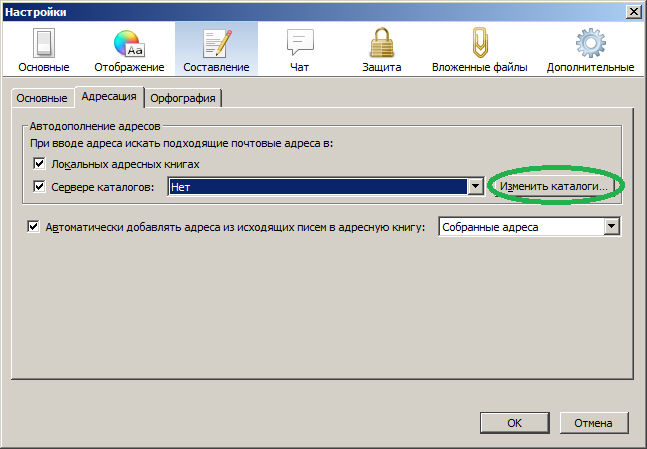 поставить флаг «При вводе адреса искать подходящие адреса в сервере каталогов», нажать «изменить каталоги», «добавить».