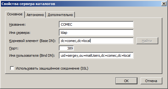 Имя пользователя — uid=<ваш_логин_в_почту>,ou=mailUsers,dc=comec,dc=local (имя указывается без домена, например uid=sergey,ou=mailUsers,dc=comec,dc=local)