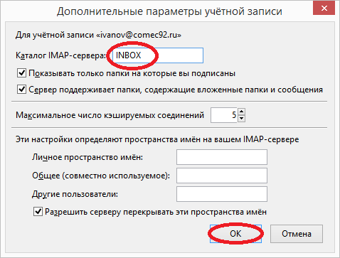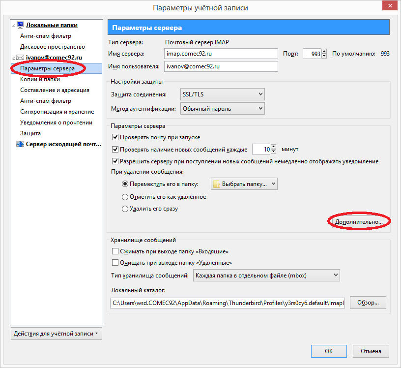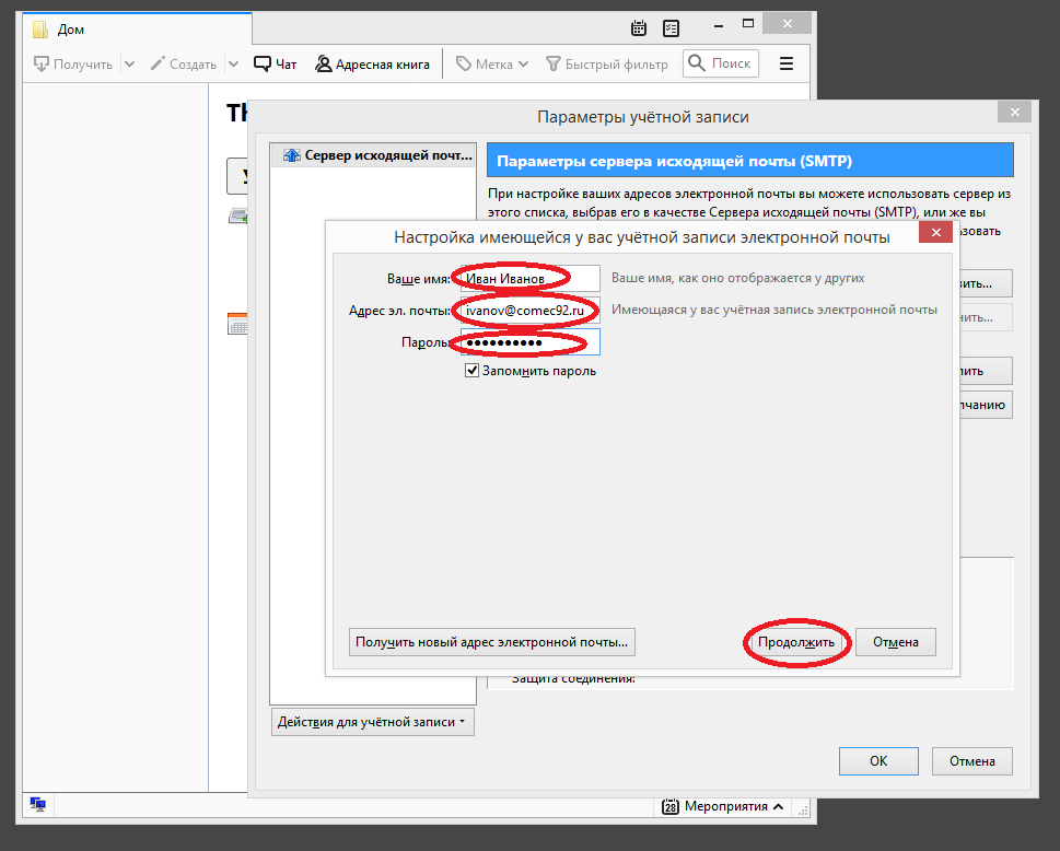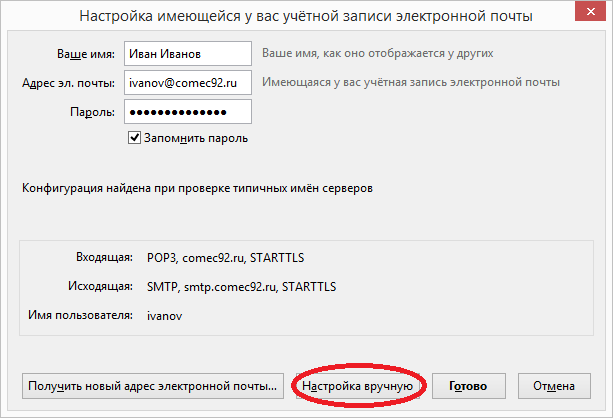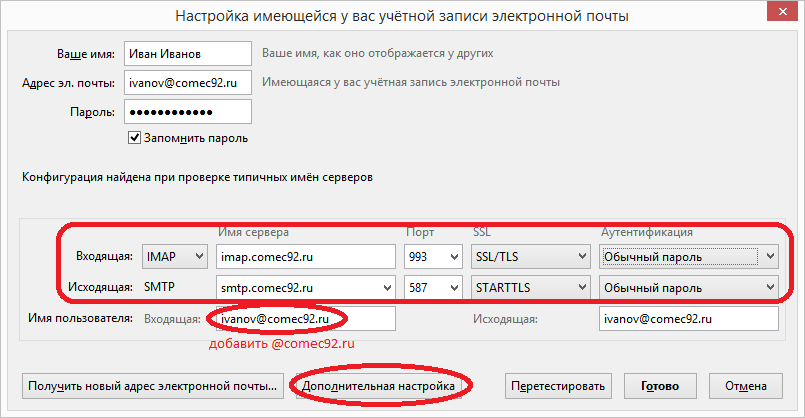 IMAP сервер: imap.comec92.ru, порт: 993, SSL: SSL/TLS, аутентификация: обычный пароль SMTP сервер: smtp.comec92.ru, порт: 587, SSL: STARTTLS, аутентификация: обычный пароль Имя пользователя: имяпользователя@comec92.ruНажать «дополнительная настройка»